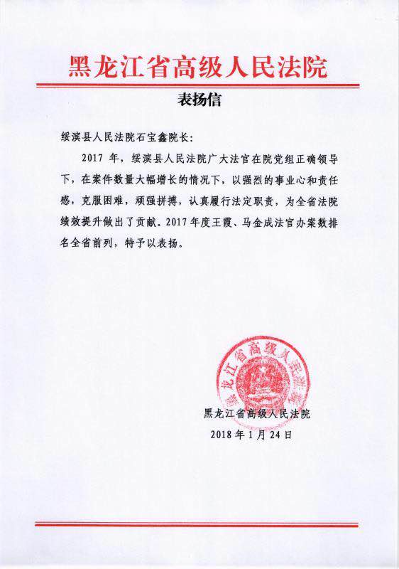 2018年 1月24日,省法院致信绥滨县法院石宝鑫院长,对绥滨县法院过去一年对全省法院绩效提升做出的贡献给予了表扬。