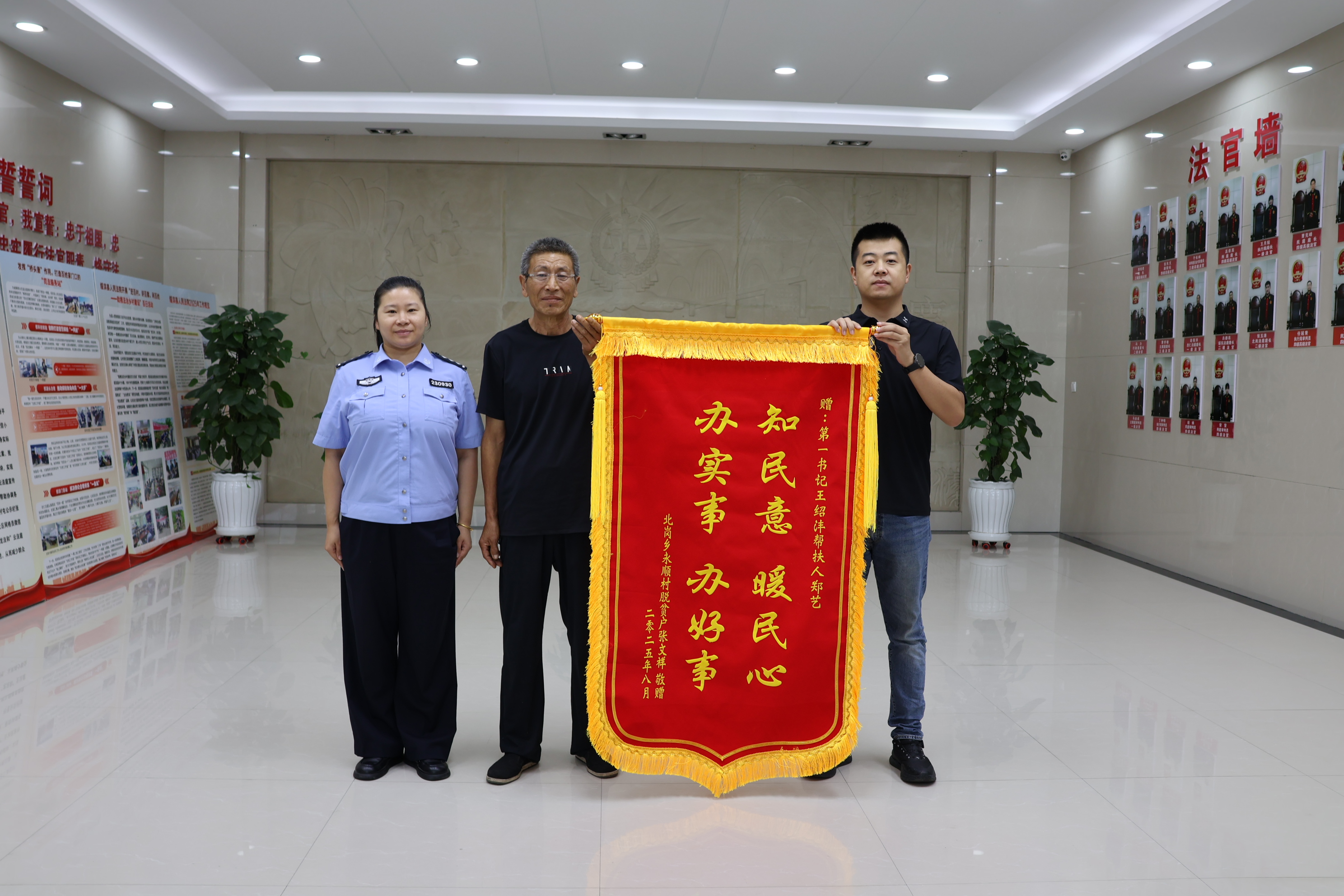 近日,北岗乡永顺村脱贫户张文祥大爷来到绥滨县法院,将一面印有“办实事、办好事、知民意、暖民心”金色大字的锦旗,郑重地交到了驻村第一书记王绍沣与帮扶责任人郑艺手中。这面沉甸甸的锦旗,不仅承载着张大爷一家深深的感激之情,更是对绥滨法院驻村工作队倾力帮扶、实干担当的生动诠释。