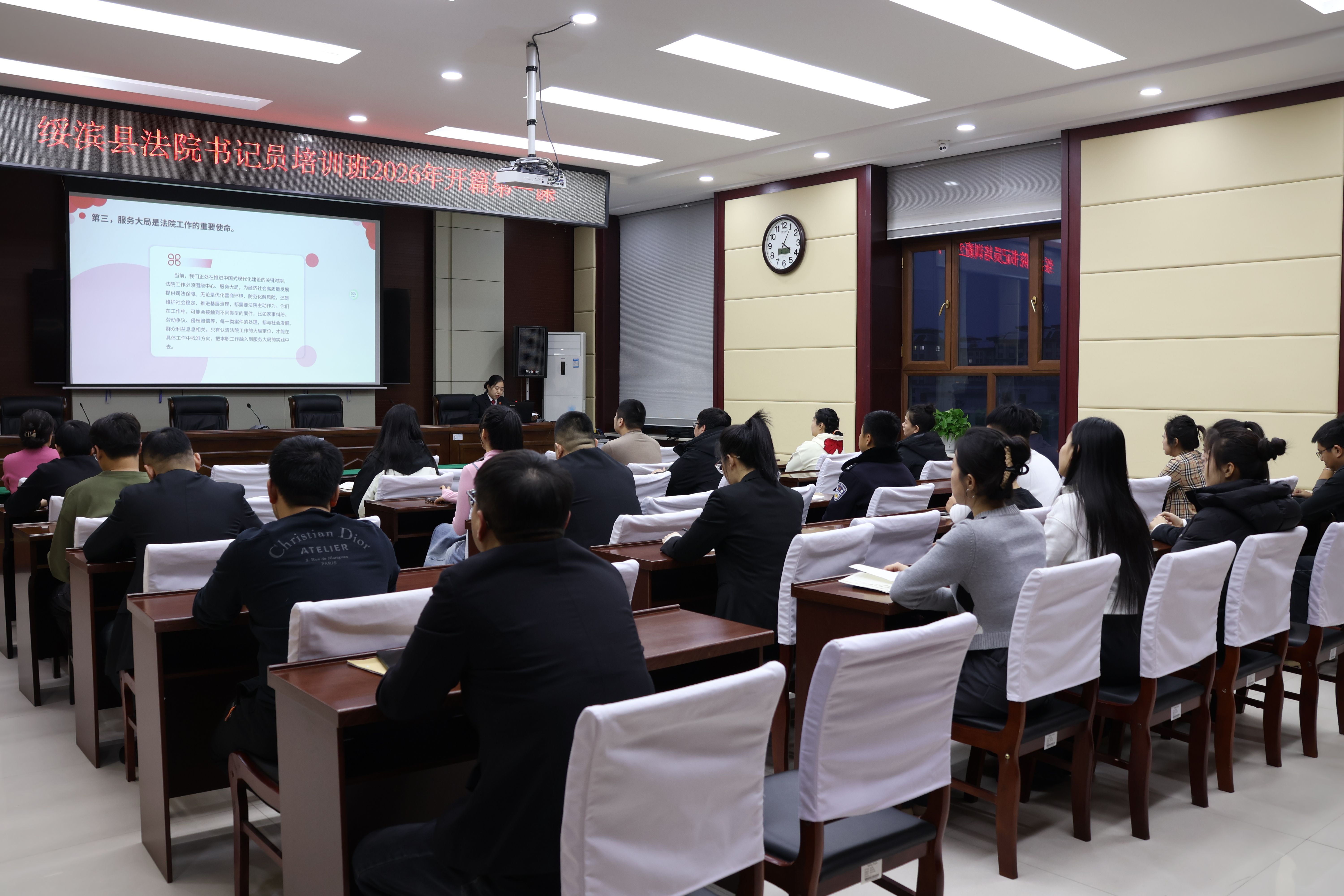 为筑牢聘用制书记员队伍政治根基,赋能司法辅助工作高质量发展,切实强化队伍规范化建设,1月7日,绥滨县法院2026年聘用制书记员专题培训正式开班,全体聘用制书记员齐聚一堂,开启新年履职能力提升第一课。开班仪式由书记员培训办负责人高庆芳主持,院党组成员、政治部主任于洋做开班授课第一讲。