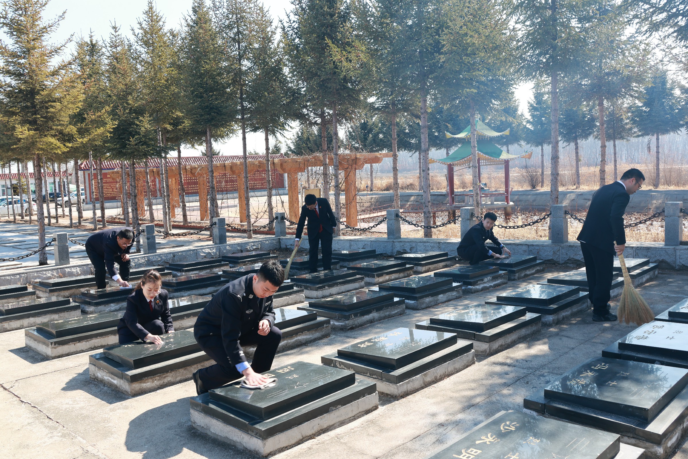 松柏凝翠,英烈千秋。革命烈士陵园内,干警们庄严肃立,向烈士纪念碑鞠躬默哀、敬献鲜花,表达对英烈的无限敬仰与哀思。随后,干警们拿起扫帚和抹布,对陵园内的杂草落叶进行清理,擦拭墓碑灰尘,以实际行动表达对英烈的尊崇与守护,用心感悟先烈们用生命诠释的忠诚与奉献,更加深刻地理解了肩上所承载的责任与使命。